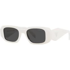 The Prada PR17WS sunglasses in talc with dark grey lenses are a vintage style making a strong comeback, with a 90s rectangle shape turned modern with bold features and sleek edges.